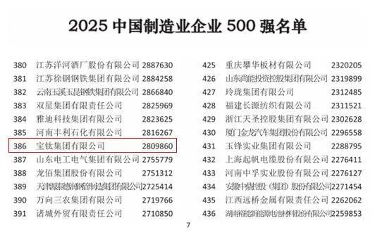 近日,2025世界制造业大会在合肥举办。会议发布了“2025中国制造业企业500强”榜单,宝钛集团首次荣登“中国制造业企业500强”,位列386位,彰显出了较强的综合实力和强劲的发展势头。